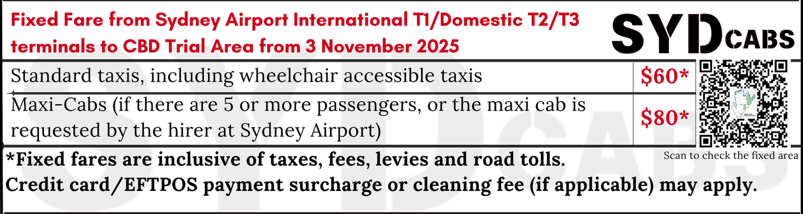 Fixed fares / maximum fares payableThe following maximum fares apply for rank and hail, single uninterrupted journeys from Sydney Airport to locations within the CBD Trial Area (as defined above):• $60 for standard taxis, including wheelchair accessible taxis.• $80 for maxi-cabs (if there are 5 or more passengers, or the maxi-cab is requested by the hirer at any of the Sydney Airport taxi ranks, other than for the carriage of a person who requires a wheelchair accessible service). Note, the ‘hirer’ can only be the passenger.• No other charges may be added to the fares set out above, other than a non-cash payment surcharge or a cleaning fee in accordance with the Fares Order 2025.• Taxi Transport Subsidy Scheme dockets can be used with these fixed fares, where applicable.