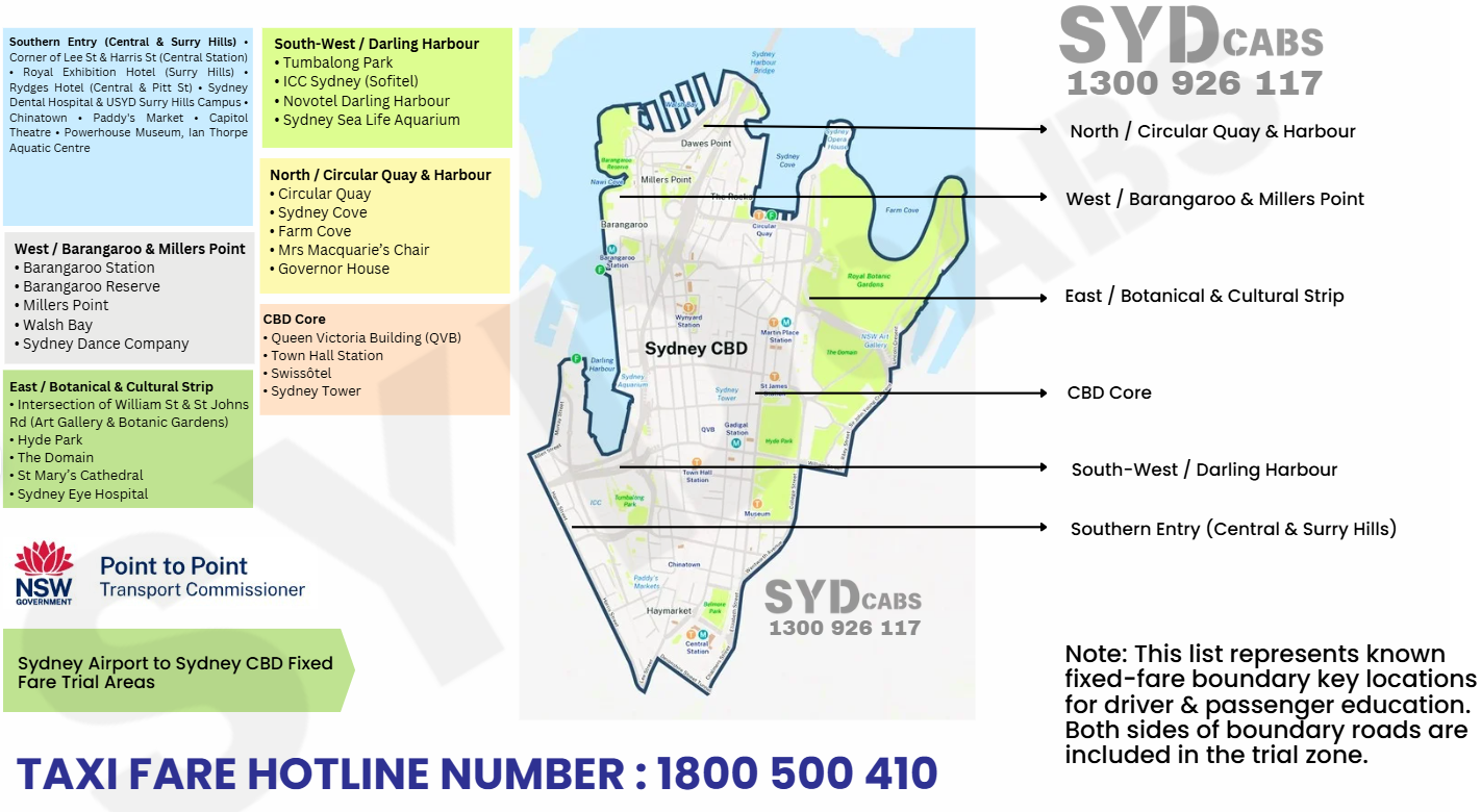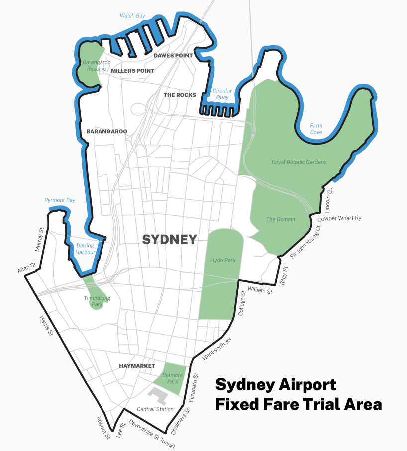 Sydney Airport Fixed Taxi Fare Trial. The NSW Government is trialing fixed fares for taxi trips from Sydney Airport to the Sydney Central Business District (CBD), for 18 months from 3 November 2025 to 2 May 2027. Taxis conducting passenger services from taxi ranks at T1 International and T2/T3 Domestic terminals to Sydney CBD must only charge the maximum fixed fare set out in the Point to Point Transport (Fares) Order 2025 (no. 2) (Fares Order 2025). For trips to all other destinations, the maximum fares set out in the Fares Order 2025 apply. These guidelines set out the trial conditions and operating requirements for taxi service providers, affiliated providers, taxi licence holders and drivers relating to services offered from SydneyAirport to the CBD. This includes the geographical boundaries of the trial area, fixed fare amounts, information to be displayed inside taxis, and rules relating to fare calculation devices (meters). The Point to Point Transport Commissioner will monitor service provider and driver compliance with the trial, including through vehicle inspections, covert plain clothes operations, audits and investigations. Complaints lodged with the Taxi Fare Hotline will also be monitored.