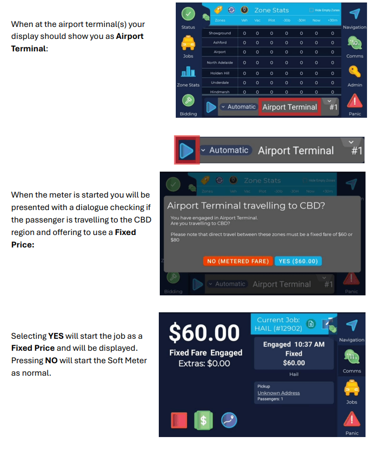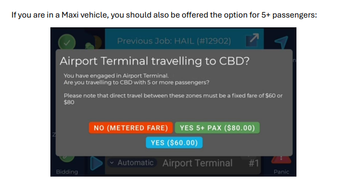 If a driver is at SYD airport (or a defined Zone) and engages the meter they will automatically be asked if they're travelling to the CBD. If their answer is 'yes', then the fare will be fixed according to the fixed trial: As you can see in the picture. Note: Standard taxi(s) will have only one option. The above options for Maxi(s). Standard taxi(s) can only select $60 Option in the meter.