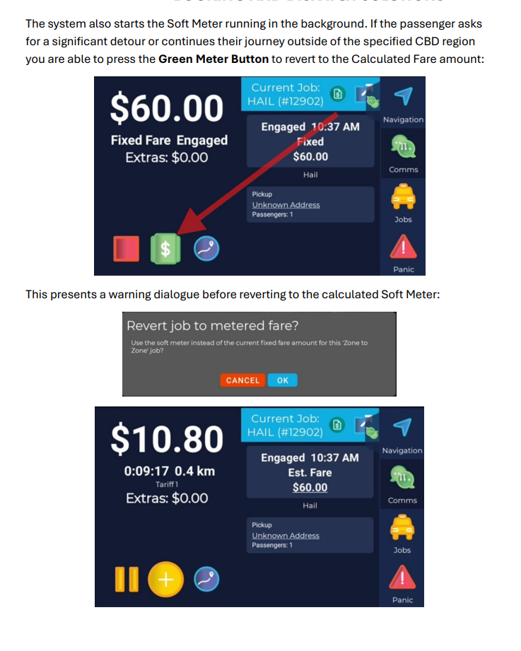 Always use the meter for rank and hail trips. (Do not jump in a rank or pickup hail Jobs if the meter got a shift restriction, meter suspended by SYD CABS due to accounts or compliance issues.)• know the boundaries of the CBD Trial Area• only charge passengers the fixed fare in accordance with the Fares Order 2025• not try to negotiate a fare or demand the passenger pay more than the fixed fare in accordance with the Fares Order 2025• not refuse a fare based on a passenger’s destination• start the meter when the taxi is hired, not before• keep the meter running throughout the entire trip unless stopping for fuel, or due to an accident or mechanical fault• ensure that the meter's display can always be clearly seen by all passengers in the taxi, that is:o their view must not be blocked( do not put your water bottle, coffee cups, etc.)o the meter must not be in sleep modeo The meter must not be placed where the passenger cannot see the fare.• for wheelchair accessible taxis, ensure that passengers using a wheelchair are safely loaded and secured before starting the meter